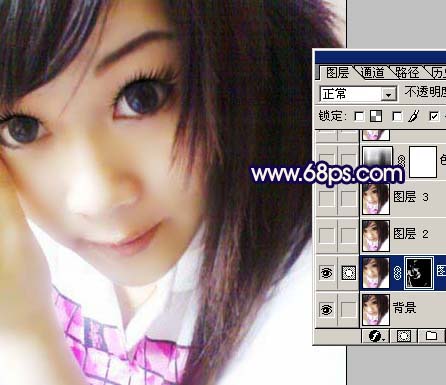 1、打開原圖素材,按ctrl + j把背景圖層復制一層,對副本執行:濾鏡 > 模糊 > 高斯模糊,數值為3,確定后按住alt鍵加上圖層蒙版,然后選擇白色畫筆,透明度為:30%左右,在人物臉上有雜點的地方涂抹給人物簡單磨下皮。