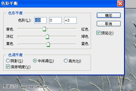 8、選擇菜單:圖層—新建調整圖層—色彩平衡,點上中間調,明度即可。