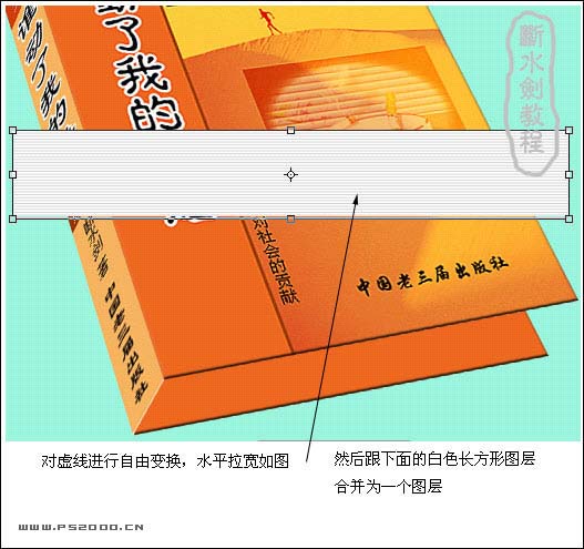 6、對虛線進行自由變化,水平拉寬如下圖,然后跟下面的白色長方形圖層合并為一個圖層。