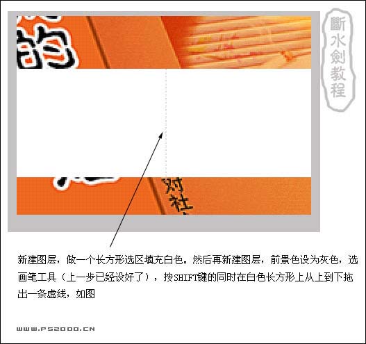 5、新建一個圖層,做一個長方形選區,填充白色。然后再新建一個圖層,前景顏色設置為黑色,選擇畫筆工具,按shift同時在白色長方形上從上到下拖出一條虛線。