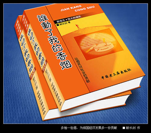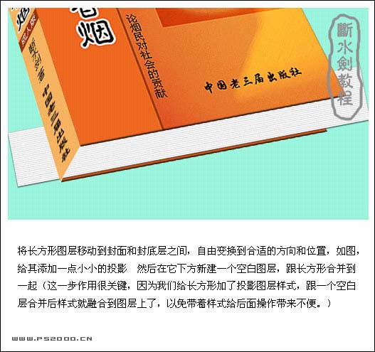7、將長方形圖層移到封面和封底層之間,自由變換到合適的方向和位置,如下圖,給添加一點小小的投影,然后在它下方新建一個圖層,跟長方形合并到一起。