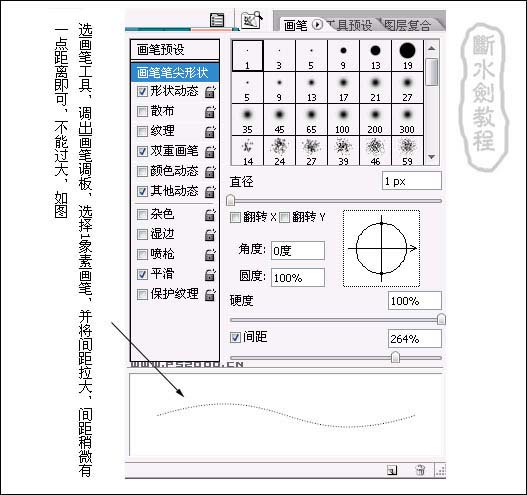 4、選擇畫筆工具,打開畫筆設置面板,選擇1像素筆刷,并將間距拉大,間距稍微有一點距離即可。