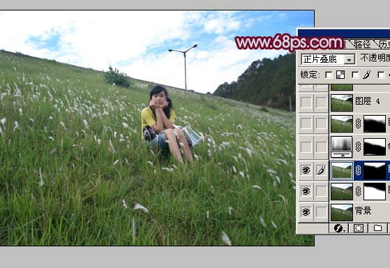 4、新建一個圖層,蓋印圖層,圖層混合模式改為“正片疊底”,加上圖層蒙版,只保留天空部分,其它地方用黑色畫筆擦掉,效果如圖6。