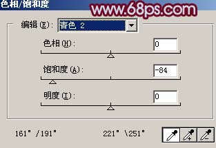 3、創建色相/飽和度調整圖層,選擇青色,然后用吸管吸取天空部分顏色,稍微降低飽和度,參數設置如圖3,效果如圖4。