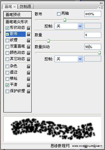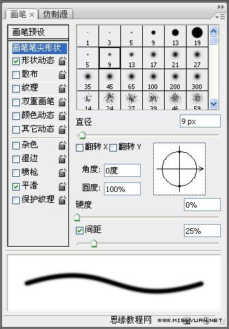 8、將前景色設為白色,背景色設為黑色,選擇筆刷工具,打開筆刷設置面板,筆刷大小為9,硬度0%,并勾選形狀動態(取默認設置)。
