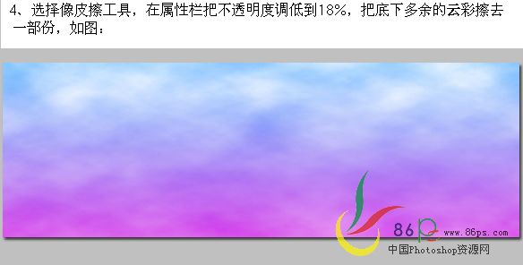 4、選擇橡皮擦工具,在屬性欄把不透明度改為:18%,把底下多余的云彩擦去一部分。