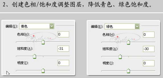 2、創建色相/飽和度調整圖層,減低青色及濾色飽和度,參數及效果如下圖。