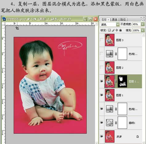 4、把剛才處理的圖層復制一層,圖層混合模式改為“濾色”,按alt鍵加上圖層蒙版,用白色畫筆把人物皮膚部分涂出來。