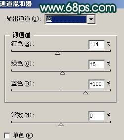 8、創建通道混合器調整圖層,對藍色進行調整,參數設置如圖13,效果如圖14。