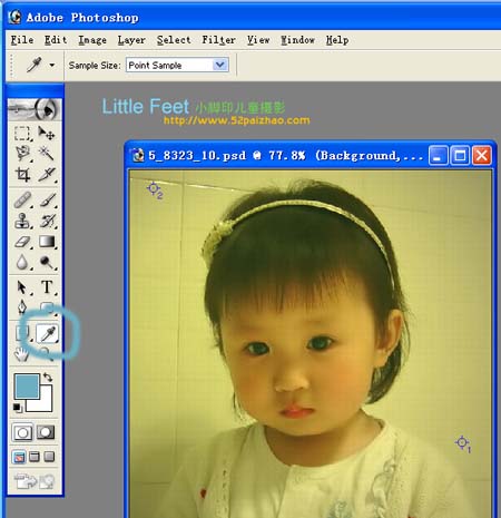 啟動photoshop,打開圖片,用“吸管”工具取2個采樣點(按住shift)作為參考,一個采樣點比較亮,另外一個比較暗。