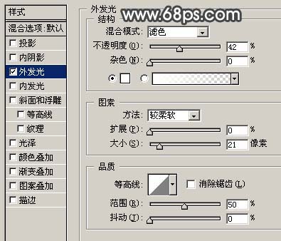7、雙擊圖層調出圖層樣式,選擇外發光,參數設置如圖9,效果如圖10。