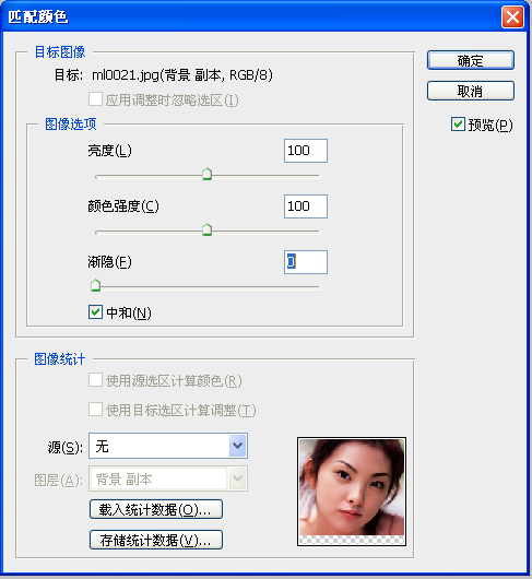 2.人物的皮膚偏紅,用匹配顏色命令調(diào)整一下,圖象-調(diào)整-匹配顏色,勾選"中和",其余數(shù)值保持默認(rèn).