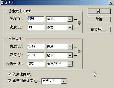 現在,我們要把這張圖片的長與寬縮小。從這個對話框上,我們可以看到現在的尺寸是440*498。一般我們總是把圖片縮小為好,而不是放大。因為放大會影響到畫面的質量。同時也盡量把長與寬按比例地縮小,這樣才不會失真。這就是要在“約束比例”前打上勾。假定你想把你的圖片的寬度縮小到220像素,就把原來的440改成220,高度就不必填了,然后按“好”。圖片就 會按比例縮小。成了這個樣子。