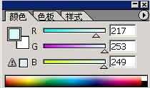 最右邊的數字框也可以直接填入由0到255之間的數字。例如:在r(紅)里,填入217;在g(綠)里,填入253;在b里填入249,現在前景色變成了淺綠色。這是rgb三原色組合表示一種顏色的方法。最下面有一個多彩的粗條,在這里可以多選一些顏色。最右邊是黑白兩色。這個顏色面板是非常方便來選擇顏色的。