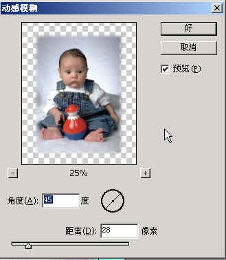 邊界有點毛邊了。這樣也行。我們再來加工一下:到菜單“濾鏡”--“模糊”--“動感模糊”,彈出對話框:角度為45度,這是一種向45度方向的模糊。距離是指模糊的大小。