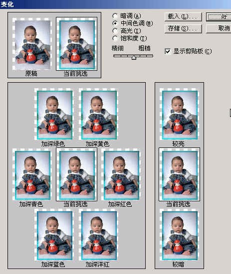 如果想要改變邊框的顏色,可以到“圖像”菜單-“調整”-“變化”,會出來對話框。你可以點“加深綠色”,或者是“加深紅色”,再加點兒紅,再加點兒黃,任意地改變邊框的顏色。上面有原稿與當前挑選。右側還有較亮或是較暗。你可以不斷地點點點,直到滿意為止。