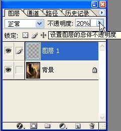 8、回到圖層面板,可以看到,圖層1填充了很多的細線。而每隔一條細線之間是透明的一條線,后面的畫面就是透過這些透明線顯示出來的。這就是前面我們做好的自定義圖案的效果。但是感覺顏色太暗了,這是因為這些線條太黑了,現(xiàn)在可以把圖層1的不透明度調一下。我是調到20%,看看效果還可以就行了。 整個畫面亮了一些。你可以根據(jù)自己在感受來調這個百分比。這是使這個圖層上的所有內容的不透明度都淡下來,也就是說使它們更加透明一些。