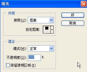 在對話框里,內容-使用,找到“圖案”,在下面的自定圖案找到前面我們做好的圖案。點“好”。
