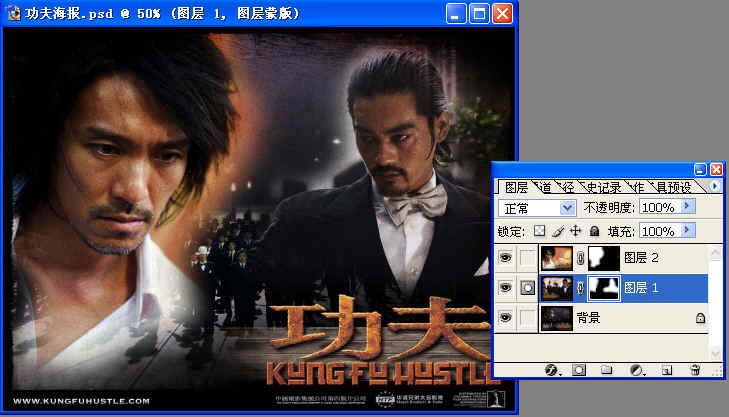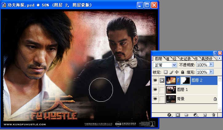 注意觀察一下:在小眼睛的右邊,原先是一支畫筆,現在變成了蒙板的樣子了。在縮略圖的后面,有一個鏈接的符號,后面又有一個白色的縮略圖,這個縮略圖的邊框是雙線的,這表示:現在可以在蒙板上進行涂抹了。再觀察一下工作區上的標題,寫的是“功夫海報.psd @ 50% (圖層2,圖層蒙板)”這表明現在是在圖層2的蒙板上工作了。(文件名是因為我曾經保存過了,可能你的文件名不一樣,沒關系的)。我們在工作開始之前,一定要明確:我現在是在什么狀況下工作,不然的話,會畫錯地方的。如果你點一下前面有畫面的縮略圖,那么,雙線框就會跑到那邊去,在蒙板縮略圖的四周只是單線框,這時,你是畫不到蒙板上的,只是在照片上涂抹了。這一點是最為關鍵的。一定要搞清楚:現在的雙線框在哪里。這個雙線框就表示現在的工作點在哪里。5、 我們看到現在蒙板上全是白色,說明圖層2的整個畫面全都顯示了,那么如果我們要去掉一些畫面,就可以用黑色畫筆來涂抹。現在把前景色設置為黑色,然后點畫筆工具,選擇柔角畫筆,大小200像素,在工作區人物之外的地方涂抹。看下圖: