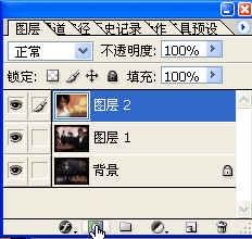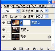 我們看到,在圖層面板下面的第二個按鈕,當你用鼠標移到它身上時,會出現“添加圖層蒙板”的字樣。按下這個按鈕,就會在圖層2上產生一個蒙板。