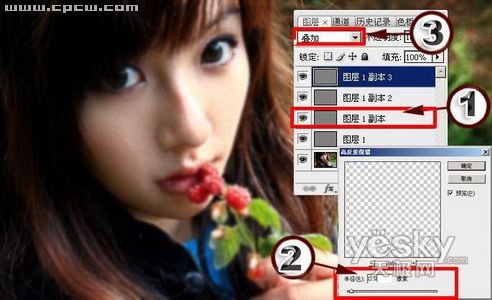 3.設置圖層混合模式為“疊加”,按“ctrl+j” 快捷鍵復制圖層,如果圖像還有模糊現象,可以多復制幾層疊加在上方。