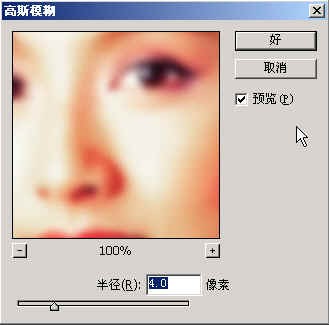 所謂濾鏡,就是一種特殊效果。我們常常要借助與濾鏡來實現(xiàn)各種各種的特殊效果。高斯模糊是最常用的。它能讓畫面模糊。模糊的程度由半徑的值來決定。這個值究竟是多少為合適呢?這不一定,要由你的感覺來試了。值越大,就越模糊。你可以左右拉動下面的小三角,一邊看效果來感覺。我這兒用了4,也許并不是最好的,你可以用3,也可以用7。在photoshop中,有許多數(shù)值都是憑感覺來試的,這給了大家各自感覺發(fā)揮的自由。現(xiàn)在上面這一層就成了“毛玻璃”了。(注意看一下:在工作區(qū)的上沿寫有“背景副本”的字樣。這表明我們是在哪一層上面工作。)