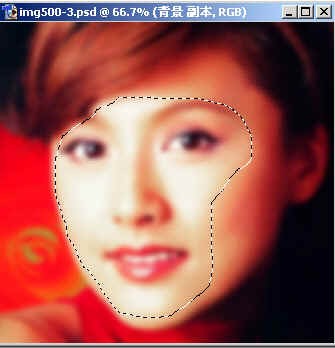 4、我們的目的是:人物的四周是朦朧的,但是,人物的面部是不應(yīng)該朦朧的。所以,要把這個范圍先選出來。現(xiàn)在用套索工具把面部勾出來。特別是臉部的亮的部位畫出來。畫完之后,再進行一下羽化。半徑用5,主要是讓虛線部分更圓潤一點。