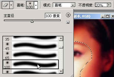 在工具欄點中橡皮擦。然后到上面的屬性欄,按下寫有“畫筆”右邊的下拉三角,點到“柔角100象素”,這是選中了一種筆刷樣式。然后再到“不透明度”選20%”。這個不透明度,表示并不是把畫面完全擦得個干干凈凈,是還留有20%的痕跡在。好,現(xiàn)在鼠標(biāo)變成了一個大圈圈。用鼠標(biāo)在選區(qū)內(nèi)不斷地來回擦拭。擦的時候要離虛線一點距離。直到慢慢變清晰一點為止。我們可以把最下面那一層“背景”前的小眼睛點一下,就是關(guān)掉,可以看到,“背景副本”變了樣,還留有一點痕跡。(一格一格的,是表示透明部分)這就是說,臉部還留下一點毛玻璃。下面右邊的圖是把背景層前的小眼睛關(guān)掉了。(要打開就再點一下)