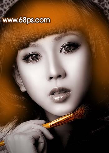 11、新建一個圖層,前景顏色設置為:#d56b04,然后稍微把人物頭發(fā)涂一下,如圖15,涂好后把圖層混合模式改為“柔光”,效果如圖16。
