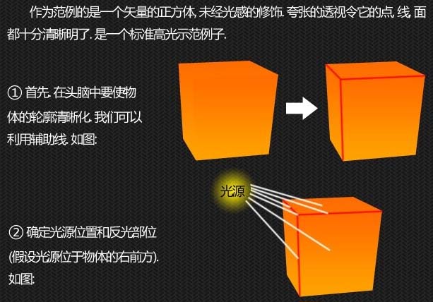 2、確定光源位置和反光部位,假設光源位于物體的右前方。