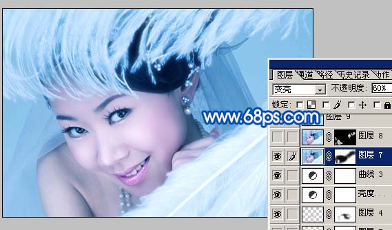 7、新建一個圖層,蓋印圖層,執行:濾鏡 > 模糊 > 高斯模糊,數值為5,確定后把圖層混合模式改為“變亮”,圖層不透明度改為:60%,加上圖層蒙版把人物部分擦出來,如圖17。