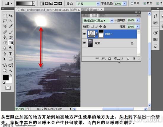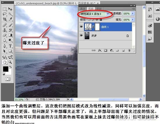 1、打開(kāi)原圖素材,創(chuàng)建曲線(xiàn)調(diào)整圖層,不做任何修改,直接按確認(rèn),然后把圖層混合模式改為“線(xiàn)性減淡”,同樣可以加強(qiáng)亮度,而且對(duì)比度更強(qiáng),下半部分基本正常不過(guò)上半部分有點(diǎn)過(guò)度,下面再修復(fù)曝光部分。