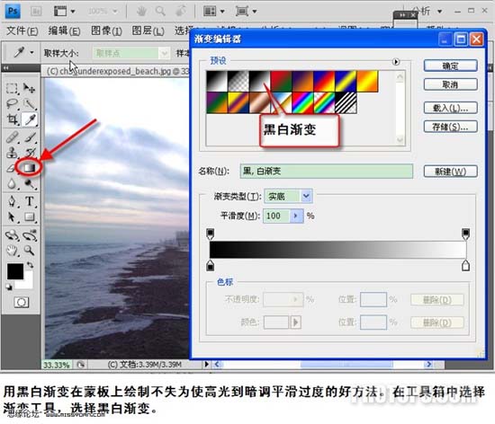 2、選擇漸變工具用,顏色設(shè)置為黑白,如下圖。