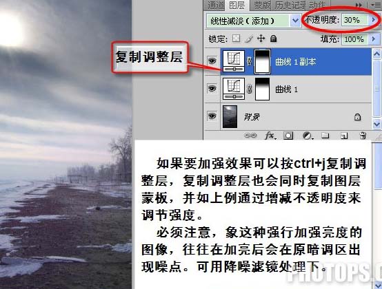 4、如果要加強(qiáng)效果,可以按ctrl + j復(fù)制調(diào)整圖層,復(fù)制調(diào)整圖層會(huì)同時(shí)復(fù)制圖層蒙版,并如上列通過(guò)增減不透明度來(lái)調(diào)節(jié)強(qiáng)度,操作后適當(dāng)?shù)慕o圖片降噪處理下完成最終效果。