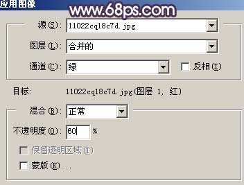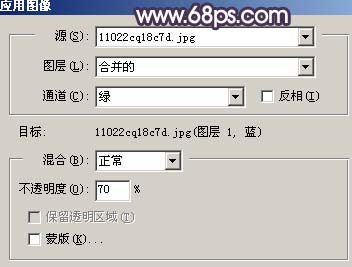 1、打開原圖素材,按ctrl + j把背景圖層復制一層,點通道面板,選擇紅色通道,執行:圖像 > 應用圖像,參數設置如圖1,確定后再點藍色通道,執行:圖像 > 應用圖像,參數設置如圖2,確定后回到圖層面板,效果如圖3。這一步簡單修復照片的色彩。