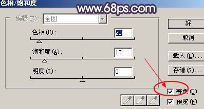 2、創建色相/飽和度調整圖層,參數設置如圖4記得勾選著色選項,效果如圖5。