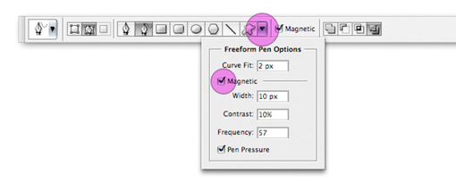 9.磁性的:當自由鋼筆工具被選擇時在自由鋼筆選項下拉列表中可用。選擇該項后,路徑會吸附到像素上。磁性的選項如下:限定路徑跨越區域的寬度,吸附路徑的像素對比度,路徑錨點的添加頻率。
