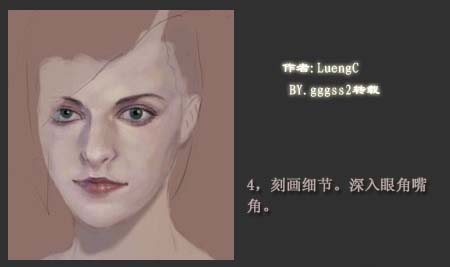 7、現在,可以說臉部已經完成了,該是頭發了。每張東西進展到70% - 80%的時候是很讓人疲憊的,巴不得馬上完成,這時候容易出現敗筆,要耐心,大師面對這么大面積的頭發是有點容易不耐煩。我直接畫成帽子。