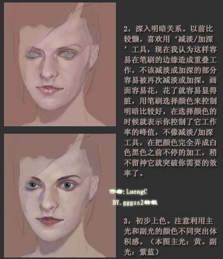 3、初步上色。注意利用主光和副光的顏色不同突出體積感。