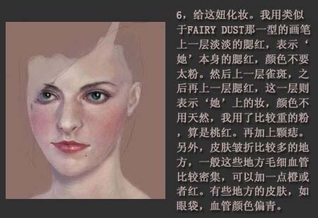 6、化妝,選擇一款好的化妝畫筆上一層淡淡的腮紅,顏色不要太粉。然后上一層雀斑,之后再上一層腮紅,這一層則顏色不用天然,我用了比較重的粉。再加上顆痣。另外皮膚皺折比較多的地方,一般這些地方毛細血管比較密集,可以加一點橙或則紅。有些地方的皮膚,如眼袋,血管顏色偏青。