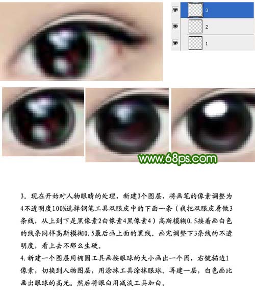 3、現在開始對人物眼睛的處理,新建3個圖層,將畫筆的像素調整為4,不透明度100%,選擇鋼筆工具在雙眼皮中下面畫一條(我把雙眼皮看做3條線,從上到下是黑線2像素,白線4像素,黑線4像素)。高斯模糊0.5,接著畫白色的線條同樣高斯模糊0.5最后畫上面的黑線。畫完調整下3條線的不透明度,看上去不那么生硬。