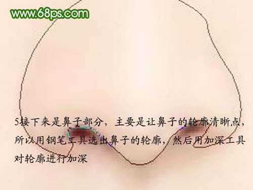 5、接下來是鼻子部分,主要是讓鼻子的輪廓線清晰點,所以用鋼筆工具選出鼻子的輪廓,然后用加深工具對輪廓進行加深。