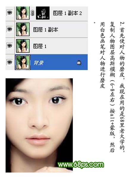 2、首先對人物磨皮,把背景圖層復制一層,執行:濾鏡 > 模糊 > 高斯模糊,數值為6-8,確定后按住alt鍵加上圖層蒙版,然后用白色畫筆涂抹臉上及皮膚上有雜點的地方。