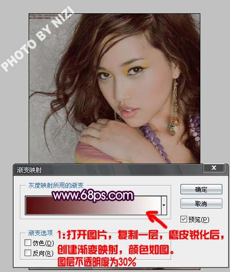 1、打開原圖素材,把背景圖層復制一層,適當的給人物磨下皮,再銳化一下,然后創建漸變顏色調整圖層,顏色設置如下圖,確定后把圖層的不透明度改為:30%。