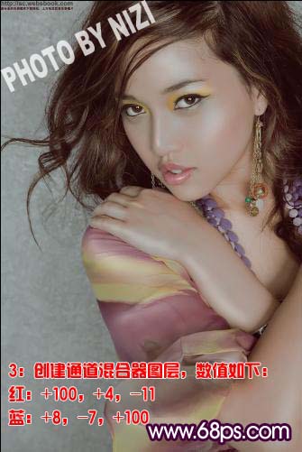 3、創建通道混合器調整圖層,參數設置:紅:+100/+4/-11,藍:+8/-7/+100。