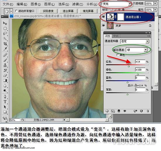 2、回到圖層面板,創建通道混合器調整圖層,對綠色和藍色進行調整,參數設置如下圖,確定后把圖層混合模式改為“變亮”。