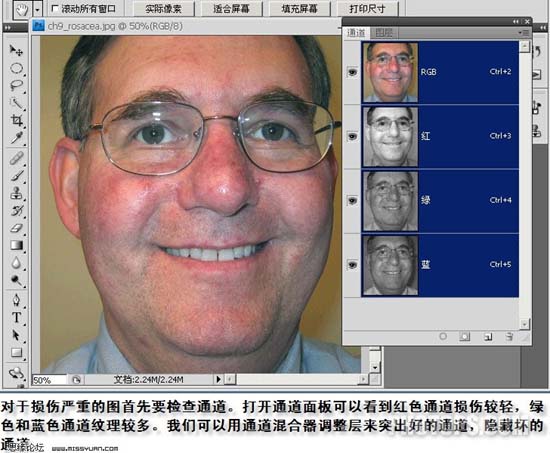 1、打開原圖素材,點通道面板,檢查通道,可以看到紅色通道損傷較輕,綠色和藍色通道紋理較多。我們可以用通道混合器調整層來突出好的通道,隱藏壞的通道。