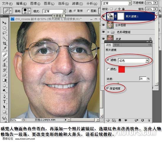 9、感覺人物面色有些蒼白,創建照片濾鏡調整圖層,選取紅色來改善膚色。至此人物修飾告一段落。下面開始改變臉和大鼻頭。
