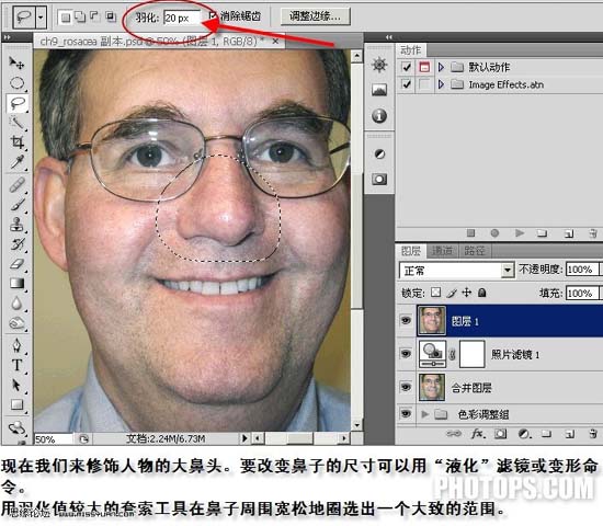 13、現在我們來修飾人物的大鼻頭。要改變鼻子的尺寸可以用液化濾鏡或變形命令。用液化值較大的套索工具在鼻子周圍寬松地選出一個大致的范圍。