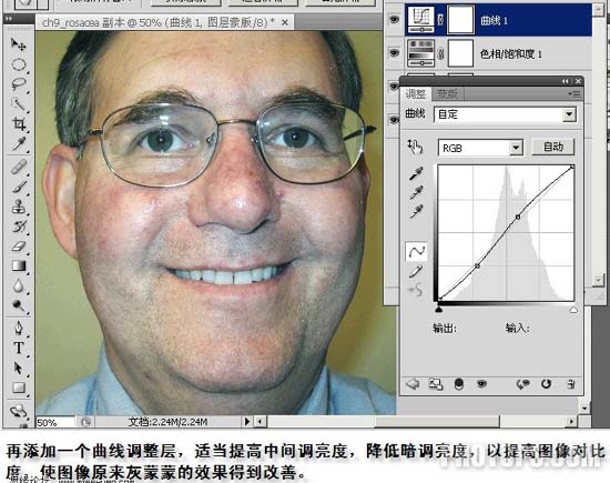 5、創建曲線調整圖層,適當提高中間調亮度,降低暗調亮度,以提高圖像對比度,使圖像原來灰蒙蒙的效果得到改善。